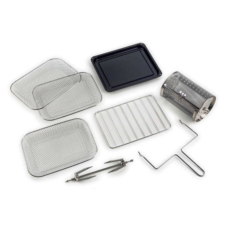 Гответе всичко, което обичате! Използвайте включените аксесоари: перфорирани кошници от неръждаема стомана, въртяща се кошница, скара, комплект за въртене и тавичка.