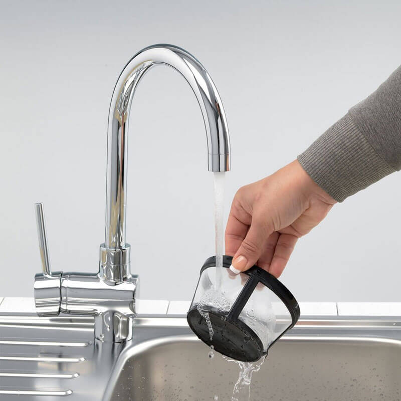 Филтърът за кафе е подвижен и лесен за пълнене, но също така и лесен за измиване директно под вода, така че кафемашината е винаги готова за следващата кана кафе.