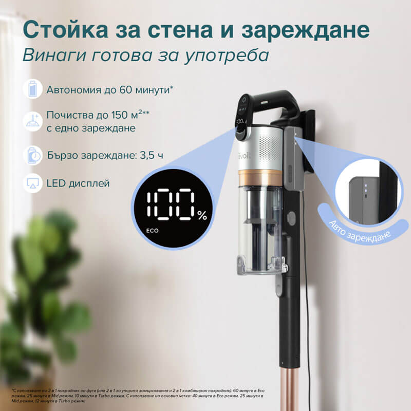 Сменяемата литиево-йонна батерия осигурява до 60 минути автономия в Eco режим и до 12 минути при Max режим. Изберете между три режима на работа в зависимост от нуждите ви – от ежедневно поддържане до интензивно почистване.