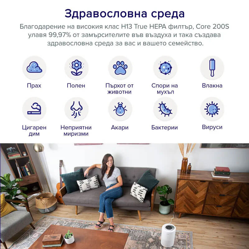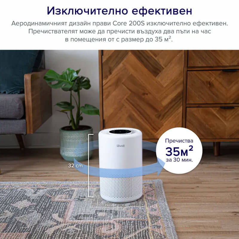 Благодарение на изключително ниското ниво на шум от едва 24 децибела, Core 200S създава релаксираща обстановка за спокоен сън.