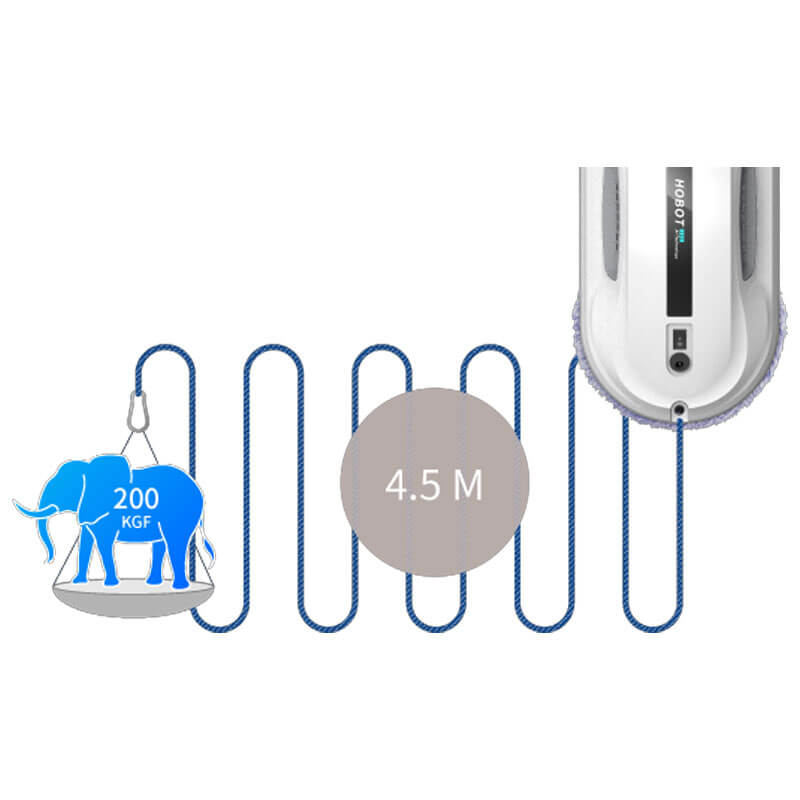 Предпазното въже с дължина 4,5 метра издържа натоварване до 200 кг. Винаги закрепвайте предпазното въже за стабилен обект вътре в помещението, когато използвате HOBOT.