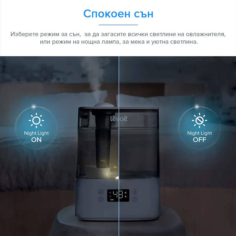 Задайте желаното ниво на влажност в помещението, а Levoit Calssic 300S ще свърши останалото. Овлажнителят сам може да регулира изпускането на пара, така че да поддържа желаното от вас ниво на влажност.