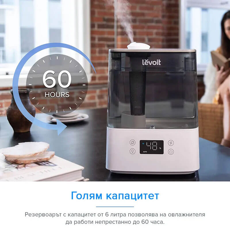 Levoit Classic 300S е подходящ за помещения с размер до 47 квадратни метра. Благодарение на големия си резервоар с капацитет от 6 литра овлажнителят може да работи без прекъсване до 60 часа.