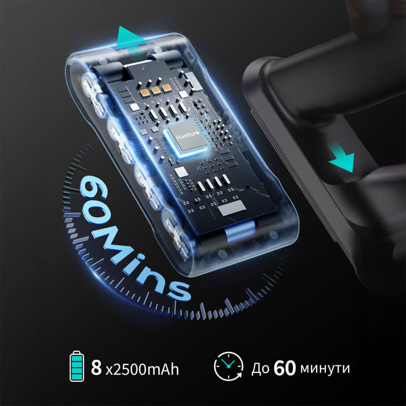 Прахосмукачката разполага с висококачествена сменяема батерия с капацитет 8×2500 mAh, осигуряваща до 60 минути работа в ECO режим за цялостно почистване с едно зареждане.
